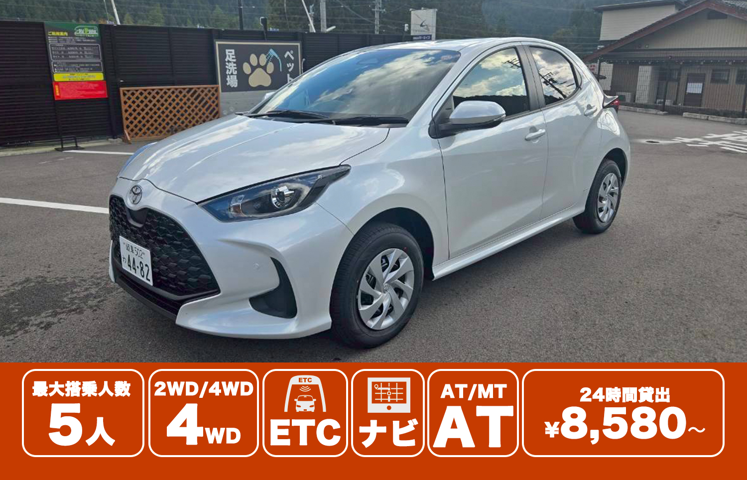 ちょい乗りで使う ヤリス 上記以外のレンタル貸出期間のプラン(6時間〜1カ月等)もございます。詳しくはお問い合わせください。 24時間貸出最低価格 ¥8,580 最大搭乗人数 5名 2WD/4WD 4WD ETC あり ナビ あり トランスミッション AT 燃料タイプ ガソリン 禁煙/喫煙 禁煙 ちょい乗りで使う