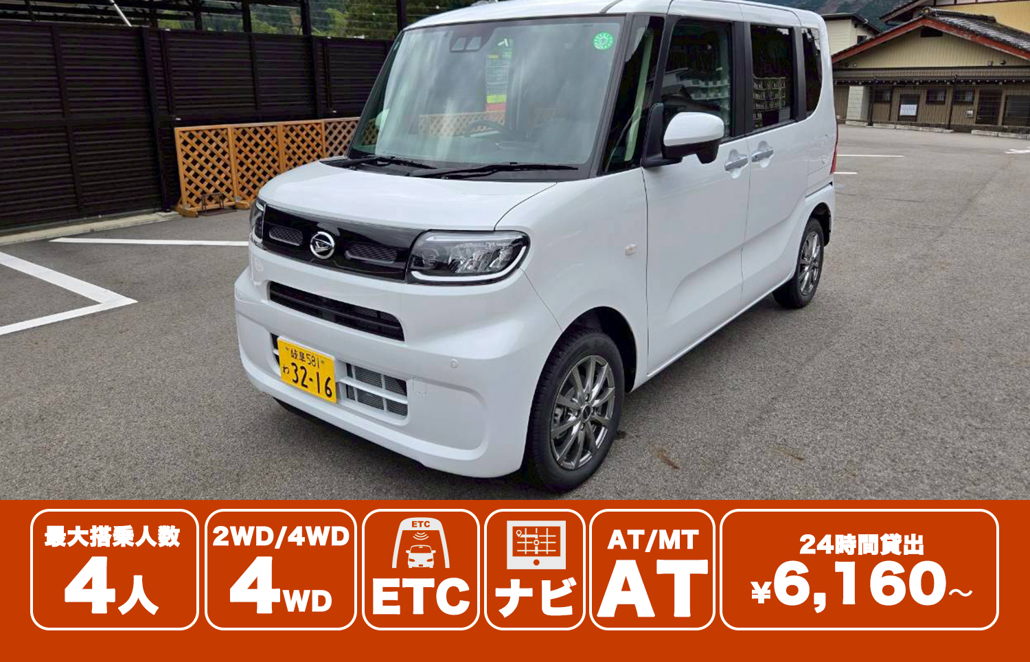 ちょい乗りで使う タント 上記以外のレンタル貸出期間のプラン(6時間〜1カ月等)もございます。詳しくはお問い合わせください。 24時間貸出最低価格 ¥6,160 最大搭乗人数 4名 2WD/4WD 4WD ETC あり ナビ あり トランスミッション AT 燃料タイプ ガソリン 禁煙/喫煙 禁煙 ちょい乗りで使う