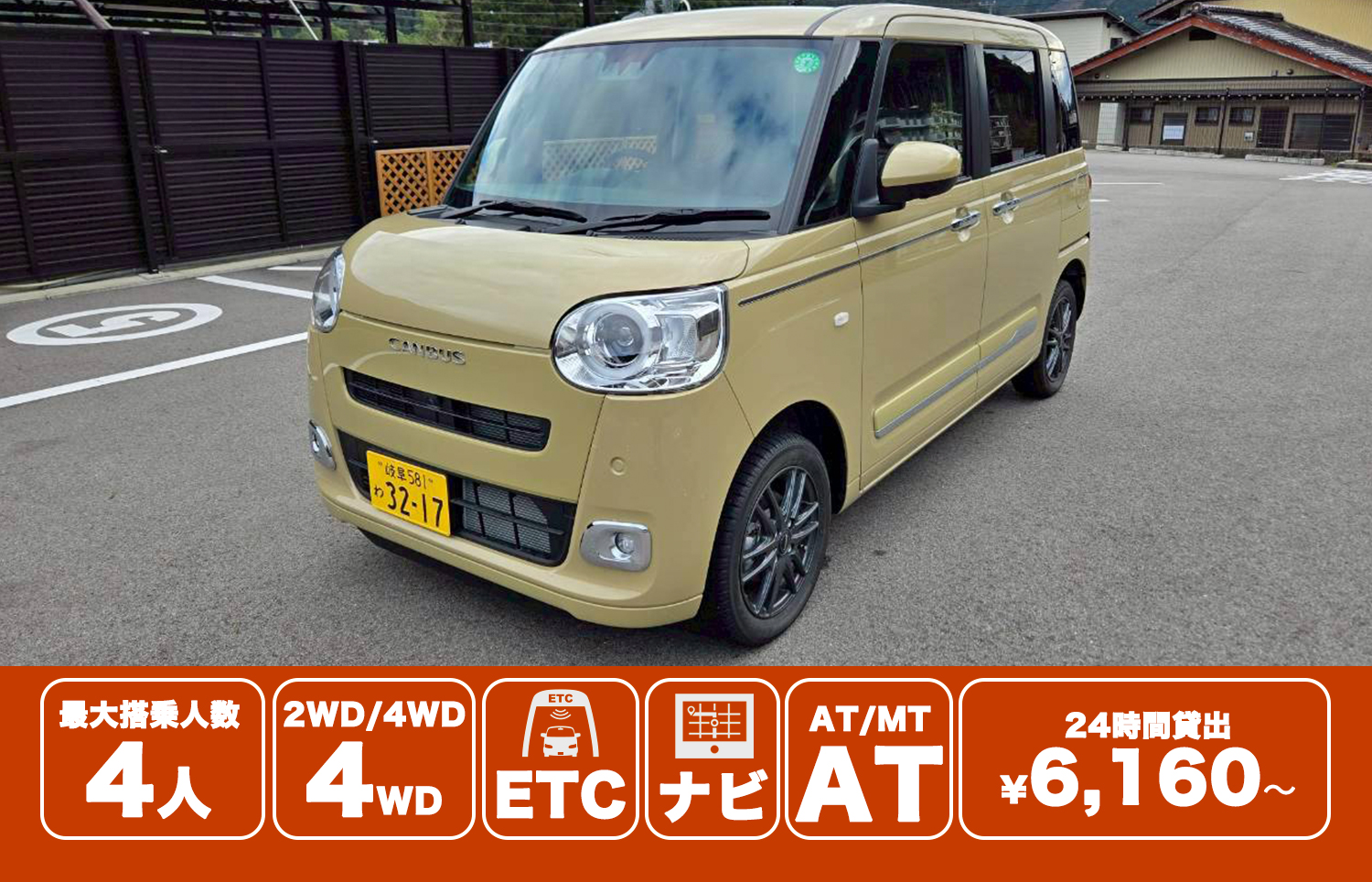 ちょい乗りで使う ムーヴキャンパス 上記以外のレンタル貸出期間のプラン(6時間〜1カ月等)もございます。詳しくはお問い合わせください。 24時間貸出最低価格 ¥6,160 最大搭乗人数 4名 2WD/4WD 4WD ETC あり ナビ あり トランスミッション AT 燃料タイプ ガソリン 禁煙/喫煙 禁煙 ちょい乗りで使う