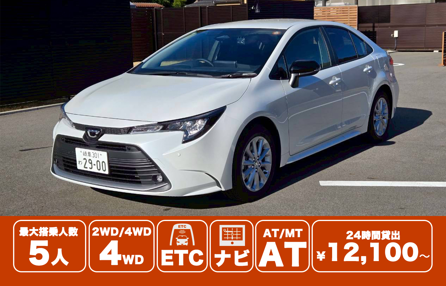 ちょい乗りで使う カローラセダン 上記以外のレンタル貸出期間のプラン(6時間〜1カ月等)もございます。詳しくはお問い合わせください。 24時間貸出最低価格 ¥12,100 最大搭乗人数 5名 2WD/4WD 4WD ETC あり ナビ あり トランスミッション AT 燃料タイプ ガソリン 禁煙/喫煙 禁煙 ちょい乗りで使う